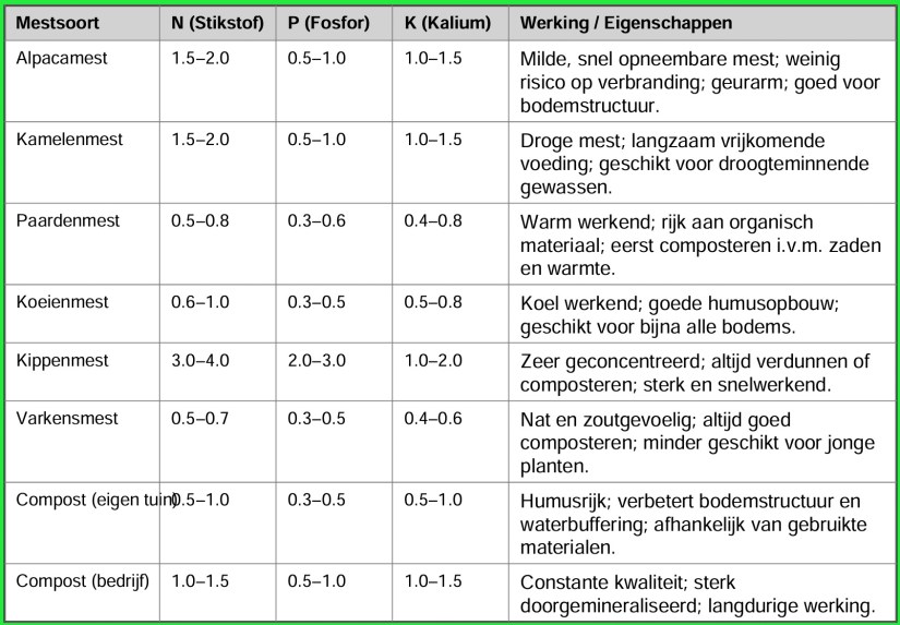 – Kippenmest is krachtig, ideaal als snelle boost maar altijd composteren.