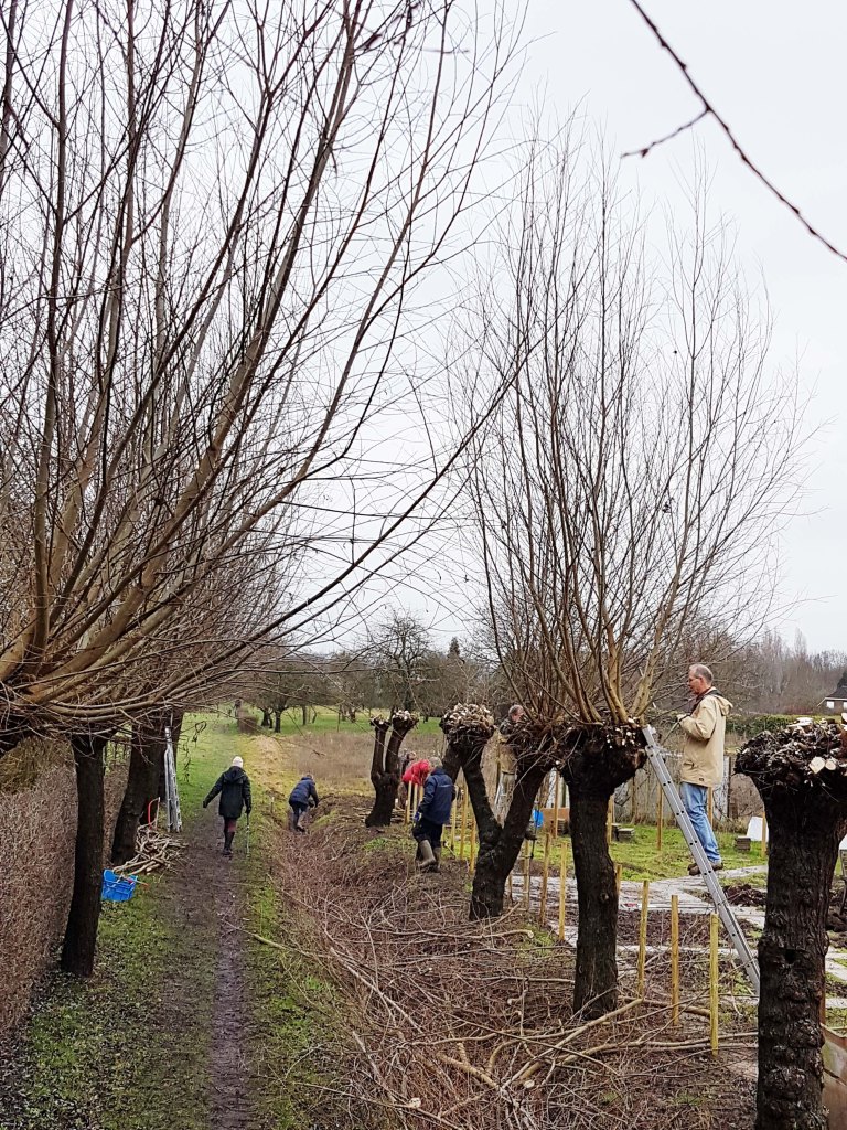 Om de twee jaar moeten deze wilgen in de winterperiode gesnoeid worden. Dat doen we samen met onze overbuurman Jan Verhagen. Het dikke snoeihout en het dunne spul worden afgevoerd. Het werk levert ook veel mooie staken op die gebruikt kunnen worden voor het opbinden van gewassen of als afscheiding van een volkstuintje.